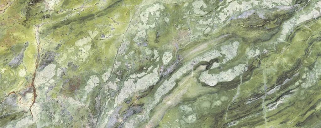Die grüne Farbe kommt überwiegend durch Serpentin, Chlorit und Talk. Die feine Maserung und Farbvariationen machen jede Platte oder jedes Schmuckstück einzigartig. Der Marmor ist relativ weich (Mohshärte etwa 3–4), was ihn leicht zu bearbeiten, aber auch empfindlich gegenüber Säuren macht.