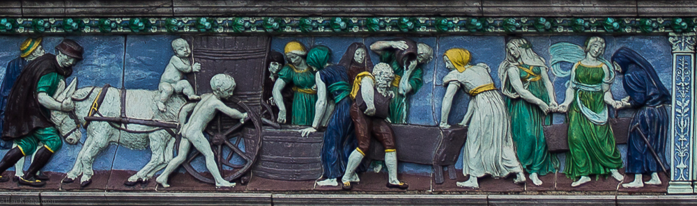 Conrad Dressler, ein Bildhauer und Töpfer, wurde mit dem Entwurf und der Herstellung einer Reihe von vier Rondellen und zwölf Tafeln an den drei Seiten des Gebäudes beauftragt. Die glasierten Keramikfriese wurden in Dresslers eigener Töpferei in Buckinghamshire hergestellt. Den größten Teil des 20sten Jahrhunderts waren diese Friese ziemlich schmutzig, doch eine Restaurierung in den 1990er Jahren brachte das Gebäude wieder in seiner ganzen Farbenpracht zum Vorschein.